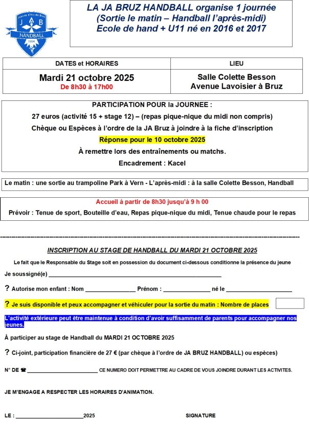 La JA BRUZ HANDBALL vous propose : le MARDI 21 OCTOBRE 2025 un stage.