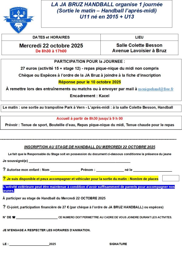 La JA BRUZ HANDBALL vous propose : le MERCREDI 22 OCTOBRE 2025 un stage.